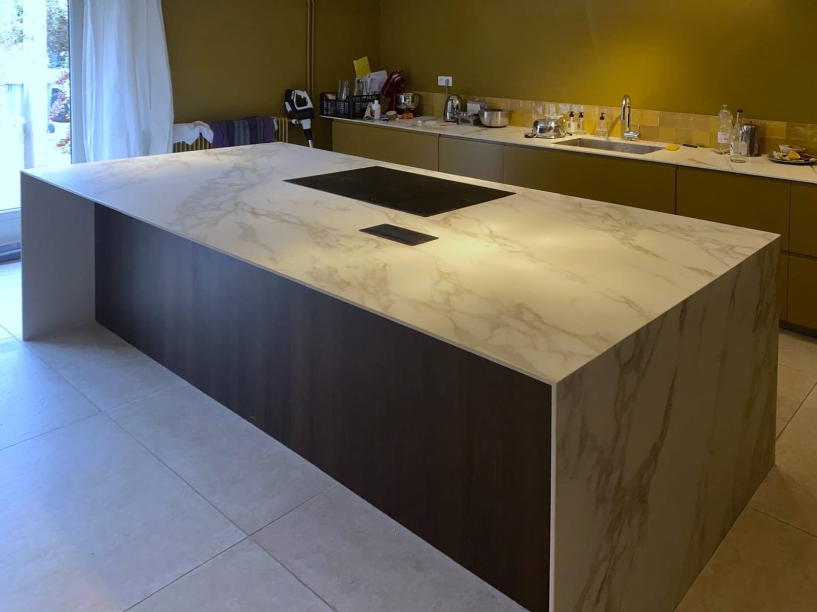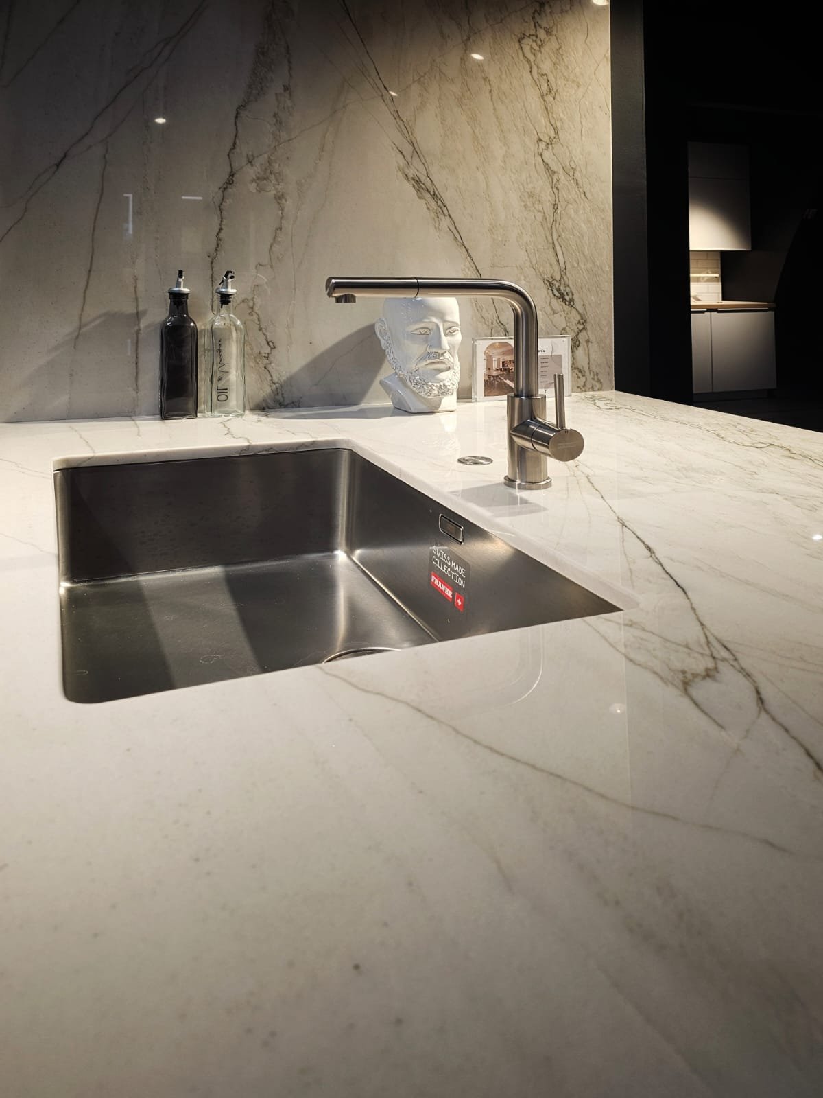 Pour un rendu raffiné et un entretien facilité, nous concevons des éviers intégrés directement dans le plan de travail. En pierre ou en céramique, ils peuvent être réalisés dans la même couleur ou issus de la même tranche de matériau, assurant une continuité esthétique parfaite avec le reste de l’aménagement. Nous proposons deux finitions : l’évier collé, discret et épuré, ou l’évier timbré, entièrement façonné dans la masse.